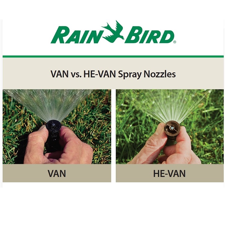 Rain Bird HE-VAN Nozzles deliver an average DULQ of 70%, more than a 40% improvement over typical variable arc spray nozzles. Their low-trajectory spray and large water droplets prevent misting and airborne evaporation. Gentle close-in watering eliminates dry spots around the spray head. covering a range from 8 to 18 feet. HE-VAN nozzles can be adjusted to the exact pattern of your lawn, ensuring your landscape will be precisely watered. Easy arc adjustment from 0° to 360°.