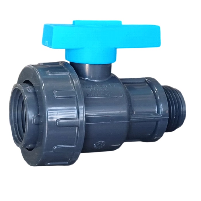 Plastic threaded (Male x Female) 1 inch single union pvc ball valves are hydraulically operated precision moulded made from PVC-U suitable up to 16 bar pressure in pipe line. Used in micro Irrigation system and lift irrigation systems for agriculture.